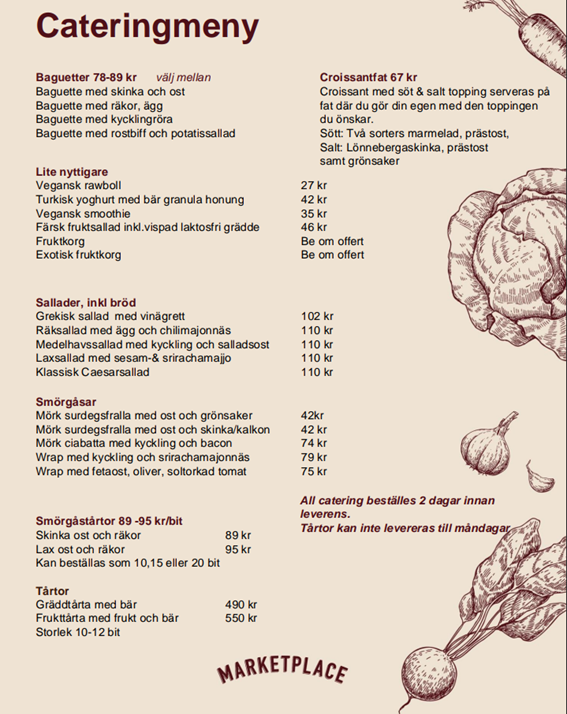 Menyn går att anpassa till både vegetariskt, veganskt eller andra liknande allergier om ni tar kontakt med Storsjömässen vid bokning.